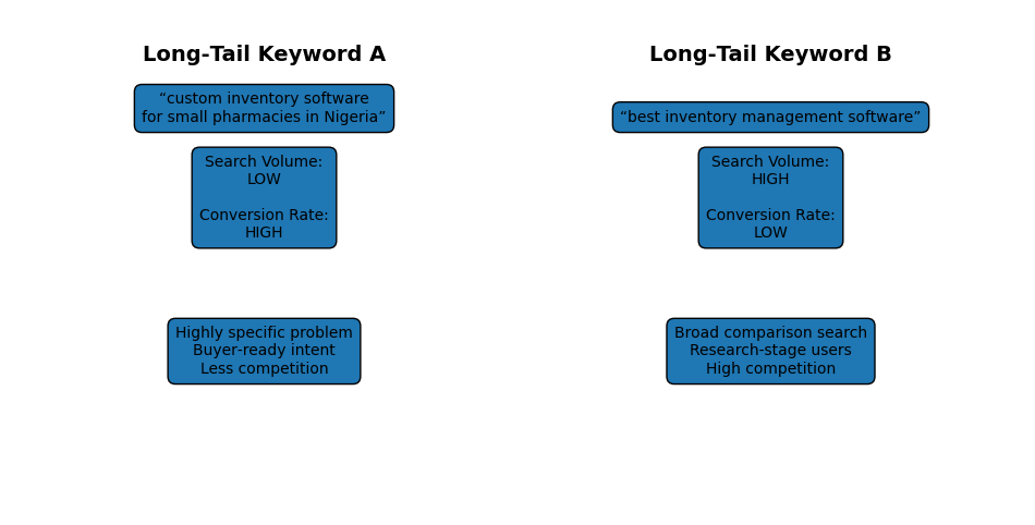 The diagram above shows two Long tail keywords A and B. The one on the left “ custom inventory software for small pharmacies in Nigeria “ might have a small search volume but have solved a specific problem.